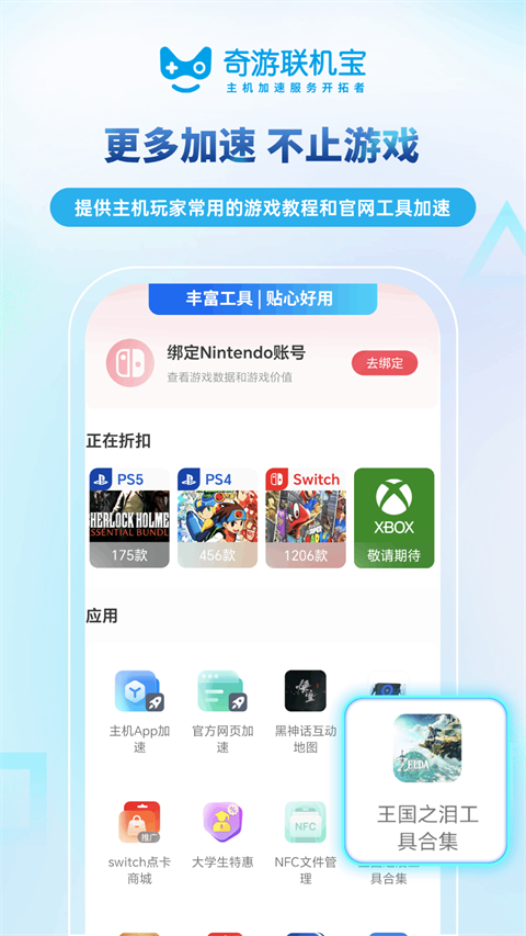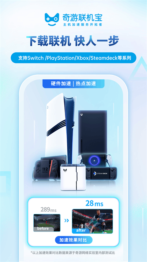 奇游联机宝App是一款游戏加速手机软件,支持PS5、PS4、Xbox、Switch、SteamDeck、Oculus Quest 2上千款主机游戏联机加速,暗黑破坏神4、宝可梦朱/紫、喷射战士3、集合啦!动物森友会、怪物猎人:崛起、战地、APEX英雄、使命召唤系列、FIFA系列等,一键加速智能分配节点,游戏不等待!解决安装慢、进不去服务器问题,杜绝卡顿、掉线、延迟高,稳定联机,省心安心!