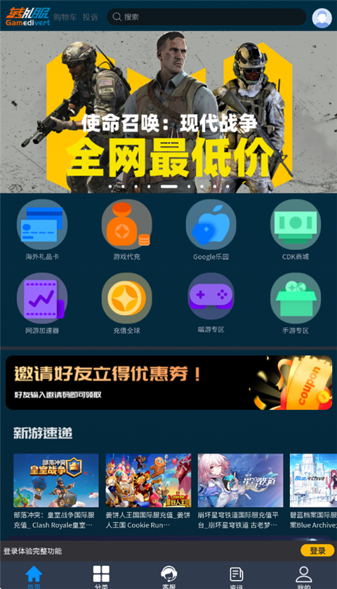 软件还提供热门、最新游戏资讯,让大家了解实时内容,现在下载注册账号邀请好友还可以享受优惠卷哦,对此有需要这类型充值服务需求的小伙伴可以下载使用!