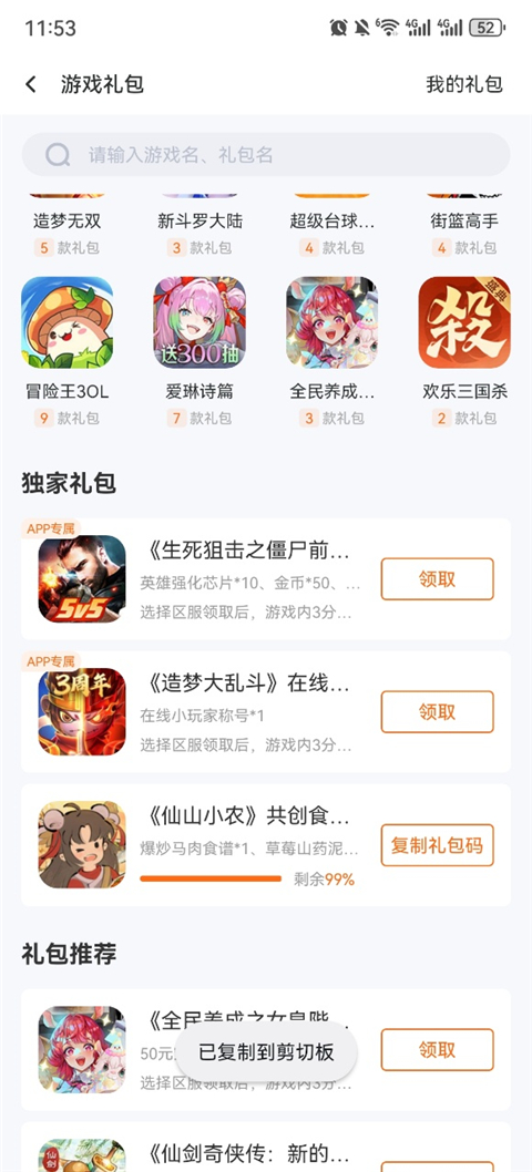 3、点击游戏礼包跳转到游戏礼包页面,部分游戏是直接复制礼包码进入游戏进行兑换即可;