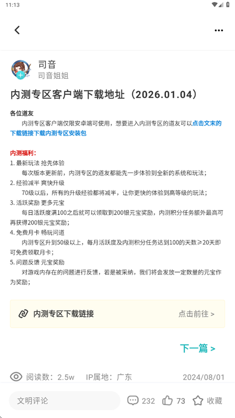 1、玩家在首页中右滑找到内测下方的下载指引;