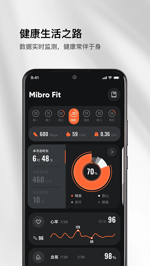 计步、心率、睡眠、体温、梅脱、体重、免疫力、疲劳度、运动记录等各项健康数据,首页实时监控。