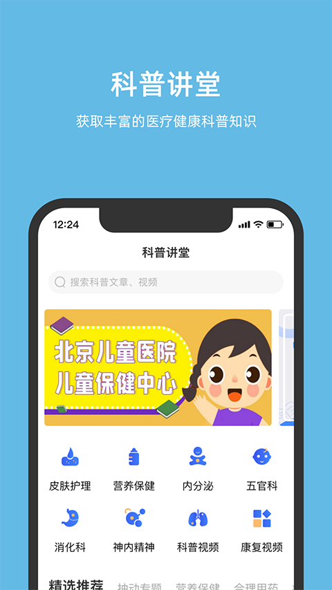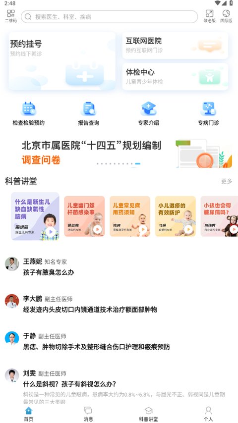 北京儿童医院手机版内置大量儿童医疗健康科普知识,用户可以在这里轻松了解各种儿童相关健康科普内容,预防儿童各种疾病。提供多种科室专家信息,患者家属可以提前了解相应专家权威性!