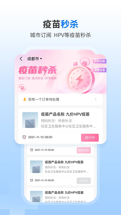 稀缺疫苗在线秒杀,支持提前订阅到城市,秒杀之前贴心提醒。