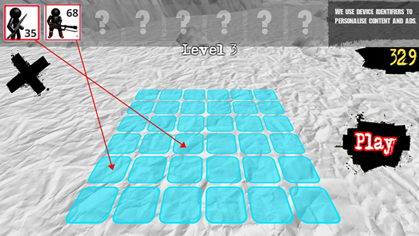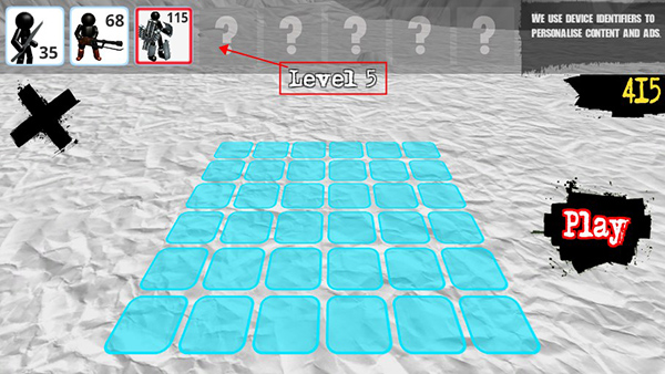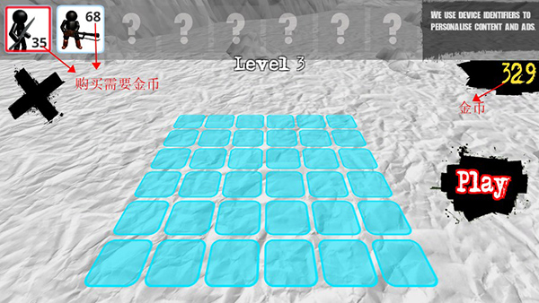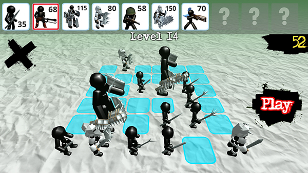 玩家选定上方要购买的火柴人之后,点击下方蓝色框框即可上阵火柴人,摆好阵型点击play即可开始游戏,如果觉得阵型不好,玩家可以点击左上角的X,重新摆阵。